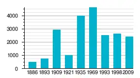 - 20. století: 1909 — 2 942 obyv.; 1921 — 1 021 obyv.; 1935 — 4 tis. obyv.; 1969 — 4,6 tis. obyv.; 1993 — 2 520 obyv.; 1998 — 2 630 obyv.