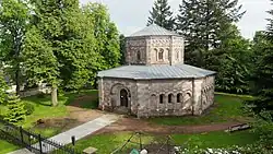 Stavba v tomto stylu je v severních Čechách unikátní. Tvar hrobky vychází ze dvou soustředných osmiúhelníků. Její povrch je tvořen střídajícími se kvádry červeného a bílého pískovce z nedalekého lomu.[1] Do hrobky se vchází vstupním portálem bohatě zdobeným pásy pletenců a palmet. Vnitřní stěny osmiboké stavby jsou vykládané černými mramorovými deskami, na kterých jsou zlatým písmem vytesané tituly jednotlivých zde pohřbených členů rodu.