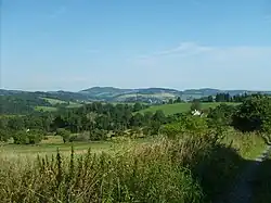 Typická pošumavská krajina u osady Loučová. V pozadí věž kostela v Petrovicích u Sušice