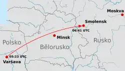 Polský prezident svoji návštěvu Katyně naplánoval na 10. dubna 2010. Jedna osoba, prezidentova poradkyně Zofia Kruszyńska-Gustová,[20] se nedostavila k odbavení. Původně měl letět i bratr zemřelého prezidenta Jarosław Kaczyński, nakonec však cestu kvůli matčině špatnému zdravotnímu stavu zrušil.[21] Letoun s prezidentem a mnoha dalšími významnými osobnostmi na palubě vzlétl s 27minutovým zpožděním z letiště Frédérica Chopina ve Varšavě v 7:27 hod. (5:27 UTC).[1][22] Letoun letěl ve výšce 8 tisíc m rychlostí 800 km/h. Krátce před tím již přistál ve Smolensku jiný vládní speciál, Jakovlev Jak-40, na jehož palubě byli převážně polští novináři, kteří měli podávat zpravodajství z průběhu celé akce. Obě letiště jsou od sebe vzdálena přibližně 800 km, což včetně vzletu a přistání obnáší o něco více než hodinu letu převážně vzdušným prostorem Běloruska. Očekávaný přílet na cílové letiště byl cca 8:42. Okolo 8:20 vstoupilo letadlo do ruského vzdušného prostoru. O několik minut později začala posádka manévr klesání a v cca 500metrové výšce stroj letiště obletěl severně, aby mohl přistát z východní strany. Komunikace s ATC Minsk a Moskva probíhala v angličtině, s dispečery ze Smolenska pak v ruštině.[7] Avšak pouze jeden člen posádky hovořil odborně rusky resp. v termínech letecké branže.
