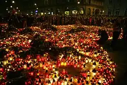 Lidé kladou svíčky a květiny před palác prezidenta ve Varšavě, 10. dubna 2010 -