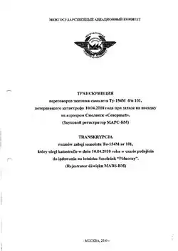 - ↑ a b c d e Межгосударственный авиационный комитет. Транскрипция разговоры экипажа Ту-154 М, № 101, который разбился 10 апреля 2010 во время захода на посадку в Смоленске "Север"/Transkrypcja rozmów załogi samolotu Tu-154 M Nr 101, który uległ katastrofie w dniu 10 kwietnia 2010 roku w czasie podejścia do lądowania na lotnisku Smoleńsk "Północ" (Přepis záznamu CVR) [pdf]. 2010 [cit. 2010-07-10]. Dostupné online pořízeném dne 2010-07-04. (polsky, rusky)