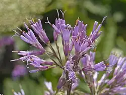 Drobné, pouze tři až pětikvěté úbory vytvářejí bohaté, chocholičnatě latnaté květenství tvořeno až 100 úbory asi 1 cm dlouhými. Lysé lůžko úboru obsahuje oboupohlavné, vespod srostlé a na vrcholu pěticípé trubkovité květy s červenofialovou, vzácně špinavě bílou korunou. Srostlé tyčinky ční z koruny, stejně jako dvoulaločná blizna. Zákrov je úzce válcovitý, jednořadý, jeho listeny jsou nafialovělé a zašpičatělé. Nažky jsou vejčité, asi 3 mm dlouhé, lysé, až s 10 podélnými žebry a s víceřadým bílým chmýrem. Hnědé nažky jsou do okolí šířeny větrem. Starší rostliny lze rozmnožit rozdělením trsu počátkem jara.[1][2][4][5]