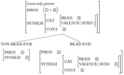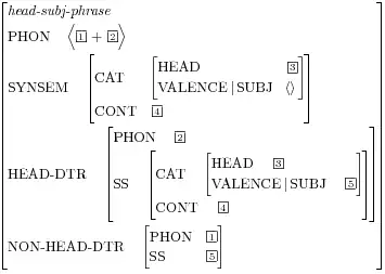 Znaky typu fráze se unifikují s jedním nebo více potomky a propagují informace vzhůru. Následující AVM kóduje pravidlo bezprostřední dominance pro head-subj-phrase, která vyžaduje dva potomky: potomka, který je hlavou (sloveso) a potomka, který není hlavou, které vyplňuje SUBJ omezení slovesa.