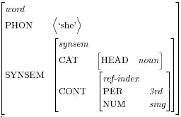 “Walks“ je znak typu slovo (word) s hlavou typu sloveso (verb). Jako intranzitivní sloveso nemá „walks“ žádné doplnění, vyžaduje však podmět, který je ve třetí osobě jednotného čísla. Sémantická hodnota podmětu (OBSAH) je koindexován s jediným argumentem slovesa (individuem, které provádí walking). Následující AVM pro slovo „she“ reprezentuje znak s hodnotou SYNSEM, který by mohl splňovat tyto požadavky.