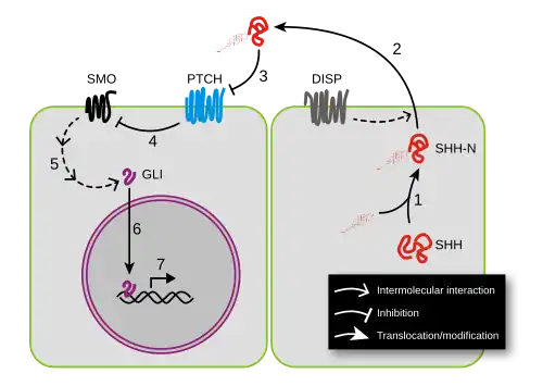 Hedgehog proteiny se vážou na membránový receptor Patched (spřažený s G proteinem). Když to udělají, Patched přestane inhibovat další transmembránový protein, Smoothened (rovněž GPCR), který následně signál převádí dovnitř buňky. Z výzkumů na octomilce je zřejmé, že se po aktivaci Patched přestane protein Cubitus interruptus (Ci) rozkládat v proteazomech. Díky tomu může Ci vstoupit do jádra a aktivovat zde určité geny, které jsou pod jeho kontrolou.