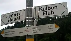 - ↑ Beschriftung des abgebildeten Wegweisers in der Mitte des unteren Schildes