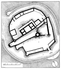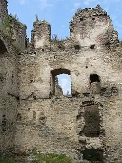 Hrad v dochované podobě je čtyřdílný, ale první nádvoří vzniklo až během pozdně gotické přestavby Václava Vlčka z Čenova. Obdélné dvoupalácové hradní jádro s bránou v jižní hradbě zaujalo nejvyšší část kopce a s výjimkou severní strany ho obepínal parkán. Paláce, které o patro převyšovaly spojovací hradby, mezi sebou svíraly obdélné nádvoří. Po jeho obvodu vedla dřevěná arkádová chodba, která spojovala prostory v prvním patře. Oba paláce byly podsklepené a ve všech patrech měly dvě kvalitně vybavené místnosti osvětlované velkými obdélnými okny. V prvním patře východního paláce se dochovaly pozůstatky táflování.[13]