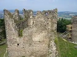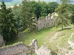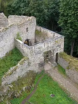 Severní hradba jádra v obou směrech pokračuje mimo jádro. Na východě ji ukončuje okrouhlá věž a na západě lichoběžníková věž třetí brány, pod kterou se nachází studna nebo cisterna. Věže spojuje obloukovitě vedená hradba, která uzavírá třetí nádvoří. Podél této hradby stály hospodářské budovy. Na severní straně se nacházelo lichoběžníkové druhé nádvoří, v jehož čele stojí do hradby vetknutý bergfrit přístupný v prvním patře sedlovým portálem. Brána do nádvoří se nacházela v severozápadním nároží. Byla kulisová a uzavírala se hřebenem. Před vlastní branou bylo předbraní.[13]
