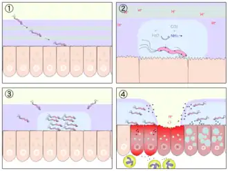 Helicobacter pylori je schopný kromě chemotaxe, která bakterii chrání při pohybu v kyselém prostředí, produkovat velké množství ureázy. Ureáza rozkládá močovinu přítomnou v lidském žaludku na amoniak a hydrogenuhličitan.[50] Oba produkty rozpadu dostávají do bakteriálního cytosolu – tvoří se neutrální oblast v žaludku. Při zvýšení pH mění hlen svoji podobu z gelu na viskóznější tekutinu. Helicobacter pylori se pohybuje lépe prostřednictvím bičíku a přichycuje na žaludeční epitel kvůli vyšší viskozitě. 10 % bakteriální buňky tvoří dusík.[51] Případný přebytek prvku je uložený v buňce jako močovina, která se účastní přeměny s pomocí ureázy.