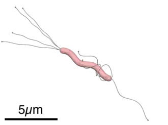 Helicobacter pylori je druh gramnegativní bakterie z rodu Helicobacter.[19] Téměř polovina světové populace je infikováno bakterií, avšak jen někteří jedinci jsou symptomatičtí.[20] Bakterie má tvar šroubu, často je její tvar popisovaný jako tvar písmena S nebo spirály. Šroubovitý tvar napomáhá bakterii proniknout viskózní žaludeční sliznicí a je ve sliznici udržovaný pomocí peptidoglykanů z buněčné stěny bakterie.[21]