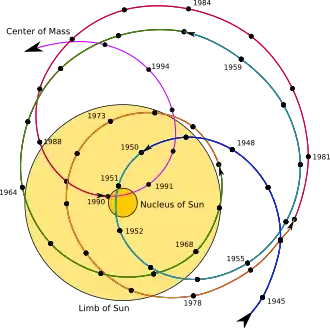 Dokonce i když omezíme diskuse na sluneční soustavu, Slunce není geometrickým centrem žádné z planetárních drah, spíše ohniskem jejich eliptických drah. Navíc vzhledem k tomu, že hmotnost planet nelze vzhledem k hmotnosti Slunce zanedbat, je centrum gravitace slunečního systému umístěno mimo střed Slunce, většinu času dokonce mimo hranice fotosféry.[6] (Hmotnost planet, především Jupiteru tvoří asi 0,14 % hmotnosti Slunce.)