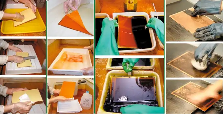 Původní heliogravura užívala měděné desky s naprášeným a teplem fixovaným jemným asfaltovým zrnem nebo kalafunou jako při technice akvatinty. Zrno sloužilo při tisku k vytvoření polotónů. Deska pak byla pokryta vrstvou želatiny, senzibilizovaná v lázni dvojchromanu draselného a usušena. Po přiložení fotografického diapozitivu nebo kresby na průsvitném papíře byla exponována na slunci nebo pod silnou lampou a vyvolána ve vlažné vodě, kterou se odplavily neosvětlené části želatinové vrstvy. Obnažená místa se leptají roztokem chloridu železitého. Po odstranění krytu se deska naválí hlubotiskovou barvou a tiskne v měditiskařském lisu.[4]