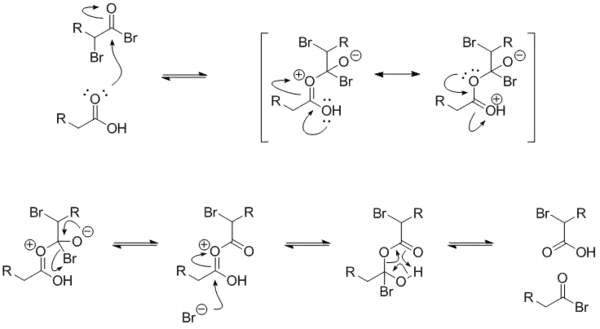 Níže je zobrazen mechanismus reakce alkanoylbromidu a karboxylové kyseliny. V důsledku odtahování elektronů dvojicí bromidů je karbonylový uhlík α-bromalkanoylbromidu silným elektrofilem.