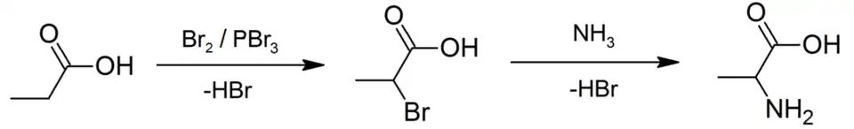 Hellovu–Volhardovu–Zelinského reakci lze využít k přípravě alaninu z kyseliny propionové. V prvním kroku směs bromu a bromidu fosforitého (sloužícího jako katalyzátor) vytvoří z kyseliny propionové Hellovou–Volhardovou–Zelinského reakcí kyselinu 2-brompropionovou,[2] ze které ve druhém kroku vznikne amonolýzou racemický alanin.[3]