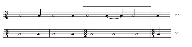 Akcentem v polovičním rozestupu vzniká jediný nadřazený 3/2 takt, čímž dochází k elegantnímu zpomalení hybnosti taktu. Tento efekt se často objevuje v barokních kadencích, především v závěru frází courantových částí skladby. Hemioly se objevují také v 6/4- nebo 6/8 taktu.
