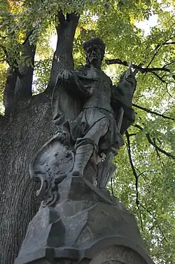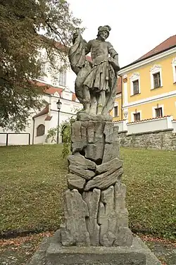 - Sv. Václav stával v Litomyšli u bývalého dvora Pernštejnů dnes je zde ulice Sokolovská. Vytvořen byl roku 1765 a po bocích ho doplňovaly dvě další sochy pravděpodobně andělů, se kterými bývá vyobrazován. Dvojice pilastrů byla po restaurátorském zásahu roku 2004 znovu obnovena, ale sochy nikoliv. Patron českého státu se svatováclavskou korunou na hlavě drží v levé ruce kopí s praporcem a u pravé nohy má erb s orlicí. Pískovcová, téměř 4m vysoká socha stojí na vysokém hranolovém podstavci. Ten je zepředu popsán textem: ,,ANNO 1765 DEN 25:AUGUSTI IST DIESE STATUA ZU EHREN DES HEILIGEN WENCESLAI LANDES PATRONS ERICHTET WORDEN UNTER DER REGIRUNG DES HOCH UND WOHL GEBOHRNEN HERRN HERN GEORG CHRISTIAN GRAFEN WALDSTENU. WARTENNERG‘‘. Strany podstavce zdobí vegetativní dekor a voluty. Nápis v zadní části: ,,UNTER IENSEITHS BEMELTEN TAG UND IAHR IST DIESE STATUA VON DEM HOCHWÜRDIGEN HERRN ADALBERTO TICHY CANONICO OB DEM VISGRHRAD ZU PRAG AUS DER MAGLIGEN DECHAEND IN LEUTOMISCHL UND ZUGLEICH VICARIO FORAN RDENTLICH EINGEVEIHET ORDEN UND ZVAR L…T DER VÜRTSCHAFFTS AMVER WALTUNG DES AUF BEMELTER HERRSCHAFFT LEUTOMISCHL ANGESTELLTE DIRECTORIS HERRN VENCES IOSEPHI SWOBODA“.