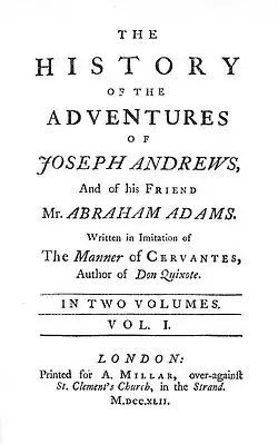 - The History of the Adventures of Joseph Andrews and his Friend, Mr. Abraham Abrams (1742, Vypravování o dobrodružstvích Josefa Andrewse a jeho přítele pana Abrahama Adamse, zkráceně Joseph Andrews). Toto dílo stojí na počátku vývoje humoristického románu. Jeho východiskem byla opět parodie Richardsonovy Pamely a jeho hrdinou je ctnostný bratr Pamely, pracující jako lokaj. Sestřiny uveřejněné dopisy ho inspirovaly k tomu, že odolal svodům své paní. Není ale za svou ctnost odměněn, nýbrž vyhozen, takže se vydá z Londýna na cestu po Anglii. V tomto bodě se autorův záměr s románem změnil. Kromě Josefa postavil do centra děje učeného, ale přesto naivního a světa neznalého faráře Adamse, a z jejich pikareskního putování vytvořil jádro románu. Oba hrdinové při svých cestách marně hledají křesťanskou lásku a další ctnosti (nevinnost, dobročinnost), až nakonec naleznou útočiště ve venkovském ústraní.[5]