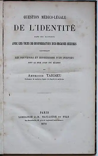- ↑ TARDIEU, Ambroise (1818-1879) Auteur du texte. Question médico-légale de l'identité dans ses rapports avec les vices de conformation des organes sexuels : contenant les souvenirs et impressions d'un individu dont le sexe avait été méconnu (2e édition) / par Ambroise Tardieu,.... [s.l.]: [s.n.] Dostupné online. (FR)