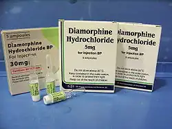 Ve Spojeném království je heroin k dostání na lékařský předpis, ačkoliv patří mezi přísně sledovaná léčiva. V souladu britským lékopisem diamorfin hydrochlorid může být použit při léčbě akutní bolesti, infarktu myokardu, akutního plicního otoku a chronické bolesti. Na léčbu chronické nemaligní bolesti musí dohlížet specialista. BNF poukazují na to, že veškerá opioidní analgetika způsobují závislost a toleranci, ale to není na překážku při mírnění bolesti v případě nevyléčitelně nemocných pacientů. Použití při paliativní péči o pacienty s rakovinným onemocněním bývá heroin aplikován automaticky dávkujícími infuzemi. V porovnání s morfinem způsobuje heroin méně nevolnosti, hypotenze, uklidnění, euforie a rozpouští se v menším množství tekutin.