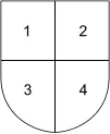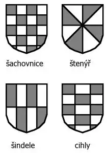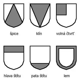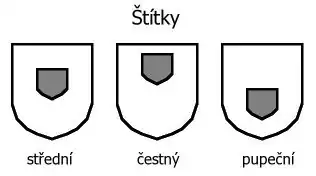 - Do středu polceného, děleného či čtvrceného štítu se může vložit znamení – střední (srdeční) štítek, který má mít stejný tvar jako štít.