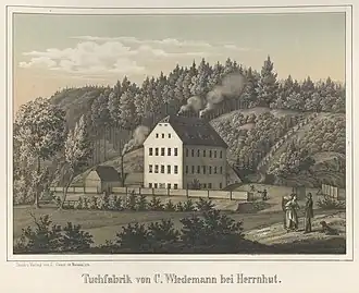 - ↑ BECHLER, Theodor. Ortsgeschichte von Herrnhut mit besonderer Berücksichtigung der älteren Zeit. Kapitola Entwicklung des gewerblichen und geschäftlichen Lebens in Herrnhut, s. 130–145.