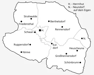 - Schwan – Obec Schwan byla v roce 1930 začleněna pod Ruppersdorf. Od 1. března 1994 je místní část města Herrnhutu. V roce 2016 měla 104 obyvatel.