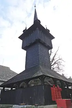 Z dubového trámového roštu vyrůstá štenýřový hranol o čtyřech rohových štenýřích, doplněný čtyřmi mezilehlými a jedním středovým štenýřem. Půdorys je čtvercový. Konstrukce je zpevněna důkladným zavětrováním. Na přesahujících částech trámového roštu jsou vztyčeny opěrné sloupky, na kterých je šikmá spodní obvodová střecha. Věž je zakončena přesahujícím zvonovým patrem s lomenou vysokou jehlancovou střechou. V rozích střechy jsou čtyři malé věžičky s kovovými korouhvičkami. Zvonice je bedněná, na zvonovém patře dekorativně vyřezávaná. Zavěšené zvony byly odlity ve dvacátých letech 20. století a jsou zdobeny ornamenty a maďarskými nápisy.[2][3] Zvonice a kostel jsou v seznamu kulturních památek místního významu.