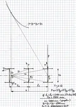 Heumann vychází z předpokladu, že při průjezdu obloukem dochází na jednotlivých kolech ke skluzům. Situaci lze zjednodušit tak, že se podvozek otáčí kolem svislé osy procházející bodem S´. Velikost momentu potřebného k natočení podvozku je dána součtem momentů třecích sil T k bodu S´. Celkový moment je roven 2.T.q1 + 2.T.q2. Graficky je zobrazen průběh velikosti momentu v závislosti na poloze středu otáčení S´ křivkou v horní části obrázku. Jediná síla, která přemáhá moment třecích sil, je řídící síla P. Její moment roste lineárně se vzdáleností středu otáčení od první nápravy. To je vyjádřeno přímkou vycházející ze středu první nápravy. Tato přímka je vedena jako tečna k uvedené křivce, její sklon, a tedy i velikost řídící síly jsou nejmenší možné. Bod, ve kterém se obě čáry stýkají, udává polohu středu otáčení podvozku. Graficky je tak vyšetřena ne přímo velikost řídící síly, ale poměr řídící a třecí síly: