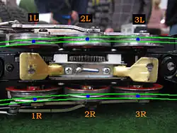 Na obrázku vlevo je pojezd tak, jak byl zachycen fotoaparátem, na obrázku vpravo jsou zeleně naznačeny kolejnice a modře styčné plochy kol a kolejnic. Kolo 1L nese největší stopy opotřebení. Toto kolo nabíhalo na kolejnici, takže došlo ke značnému opotřebení okolku, které zejména vynikne ve srovnání s okolky 3. dvojkolí. Žlábky v kolech způsobené kontaktem s hlavami kolejnic, které mají u této železnice kruhový průřez, svědčí o různém namáhání jednotlivých kol. Nejvíce je v tomto směru opotřebené 1. dvojkolí, zde dochází k největším smykům v příčném směru. U druhého dvojkolí je již opotřebení do hloubky jízdní plochy menší, u třetího dvojkolí je minimální, ale přesto patrné. Opotřebení u třetího dvojkolí koresponduje s faktem, že toto dvojkolí se pohybuje v (téměř) radiální poloze a jízdní plocha je namáhána pouze podélnými skluzy a spinem.[5].