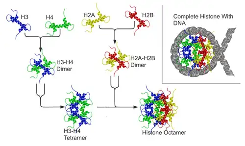 Rozlišuje se pět základních typů histonů: H1, H2A, H2B, H3 a H4. Histony H2A, H2B, H3 a H4 tvoří vždy ve dvou kopiích oktamery, kolem nichž se obtáčí dvojšroubovice DNA. Tento útvar se nazývá nukleozom.