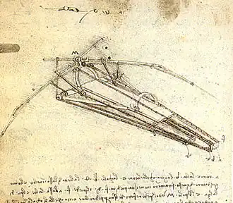Za duchovního otce letectví je považován Leonardo da Vinci, který žil mezi lety 1452 a 1519. Nakreslil více než 150 návrhů létajících zařízení, mimo jiné vzdušný šroub – vrtulník a padák. Domníval se, že k letu stačí síla člověka, ke konci svého života si však uvědomil, že je potřeba síla mnohem větší, proto začal pracovat s myšlenkou pevného, nepohyblivého křídla. Nikdy se však nedostal k tomu, aby některý ze svých návrhů vyzkoušel.