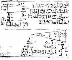 Rhindův papyrus je nejrozsáhlejší a nejvýznamnější matematický text ze starého Egypta, byl opsán kolem roku 1560 př. Kr. písařem Ahmosem z materiálu pocházejícího z doby vlády Amenemheta III. (asi 1853 až 1809). Obsahuje 87 úloh s návody a řešeními a dvě tabulky, ve kterých jsou různé zlomky zapsány jako součet kmenových zlomků (zlomek je zapsán jako součet zlomků s čitatelem 1).[3]