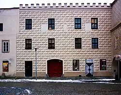 - ↑ Prodej komerčního objektu, 4 409 m² Slavonice, 37881, Jana Žižky: Nabízíme prodej historického domu v obci Slavonice o celkové ploše 4409 m². Jedná se o dvoupodlažní budovu s uzavřeným vnitřním atriem. V obou podlažích jsou situovány pokoje, neprůchozí přístupné z chodby. V každém pokoji je zavedené umyvadlo, WC, kuchyňka společná. V 1. nadzemním podlaží se nachází tělocvična, umývárny, skladové prostory a samostatná bytová jednotka. V 2. nadzemním podlaží je 31 pokojů... Součástí budovy je i kotelna... Dům je napojen na veřejný vodovod a kanalizaci...stropy v 1. nadzemním podlaží jsou klenuté, v 2. nadzemním podlaží dřevěné trámové, krytina z keramických tašek...jedná se o kulturně chráněnou památku. [online]. sidlorealit.cz [cit. 2021-03-10]. Dostupné v archivu pořízeném dne 2021-04-23.