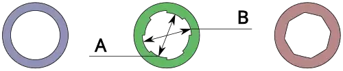 Drážkovaný, A = průměr pole, B = průměr drážky