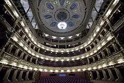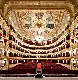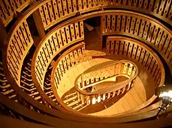 - tradičních kamenných divadel má tvar písmene U nebo podkovy a uspořádání sedadel patrové (parter, lóže, balkóny, galerie) a je kryté střechou. Bývá většinou odděleno od jeviště proscéniem (orchestřištěm), portálem a oponou. V dolní části portálu (to je před hledištěm) je navíc instalována rampa. Hlediště šlechtických divadel 18.-19. století mívalo lóže a balkóny i po stranách jeviště a někdy také nad jevištěm.