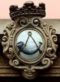 Na stříbrném podkladu se nachází černá lovecká trubka se zlatým kováním a černobílou šňůrou.