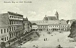 Hlučín, náměstí, v pozadí farní kostel svatého Jana Křtitele. Dobová pohlednice, před 1921.