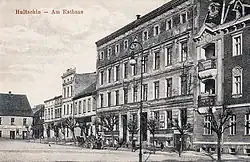 Hlučín, náměstí, budova radnice. Dobová pohlednice, před 1919.
