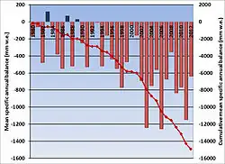 Rozhodující pro přežití ledovce je jeho hmotnostní bilance nebo povrchová hmotnostní bilance, rozdíl mezi akumulací a ablací (sublimací a tavením). Globální oteplování může způsobit kolísání teploty i sněžení, což může vést ke změnám v hmotnostní bilance. [1] Změny v hmotnostní bilanci řídí dlouhodobé chování ledovce a jsou nejcitlivějšími klimatickými ukazateli na ledovci.[2] V letech 1980–2012 je průměrná kumulativní hmotnostní ztráta ledovců, které hlásí hmotnostní bilanci Světové monitorovací službě ledovců, −16 m. To zahrnuje 23 po sobě jdoucích let záporných hmotnostních bilancí.