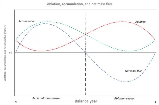 Ledovce typicky hromadí hmotu během části roku a po zbytek roku hmotu ztrácejí; jedná se o „akumulační sezónu“ a „ablační sezónu“. Tato definice znamená, že míra akumulace je větší než míra ablace během akumulační sezóny a během ablační sezóny je to naopak. [6] „Bilanční rok“ je definován jako čas mezi dvěma po sobě jdoucími minimy v hmotě ledovců - tj. od začátku jedné akumulační sezóny do začátku další. Sněhová plocha na těchto minimech, kde se sníh začíná hromadit znovu na začátku každé akumulační sezóny, je ve stratigrafii sněhu identifikovatelná, takže použití bilančních let k měření hmotnostní bilance ledovce je známé jako stratigrafická metoda. Alternativou je použití pevného kalendářního data, ale to vyžaduje každoroční terenní návštěvu ledovce k tomuto datu, a proto není vždy možné přesně dodržet přesná data s metodou pevného roku. [9]