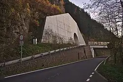 Západní portál je tvořen opěrnými zdmi z prostého betonu a je rozčleněn na tři části. Boční zeď rovnoběžná s kolejí, čelní portálová zeď (kolmá na koleje) a zeď, která je souběžná s přístupovou cestou k portálu.[5]