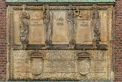 Tělo věže je vyzděno z tmavorudých cihel (v rašelině vypalované klinkery). V jeho spodní části nad vchodem je umístěna pískovcová deska se dvěma erby, nad nimiž jsou vyobrazeny čtyři postavy, které jsou zosobněním čtyř vlastností: Síla, Moudrost, Spravedlnost a Shovívavost.
