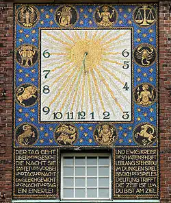 Sluneční hodiny na jižní straně byly navrženy v r. 1914 Friedrichem Wilhelmem Kleukensem a vyhotovila je firma Vereinigten Werkstätten für Mosaik und Glasmalerei Puhl & Wagner – Gottfried Heinersdorff v Berlíně-Neukölln. Jsou rámovány zvířetníkem a obsahují první a poslední – poněkud upravené – sloky básně od Rudolfa G. Bindinga: