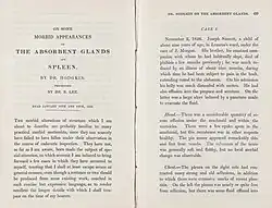 Hodgkinův lymfom byl poprvé popsán ve zprávě Thomase Hodgkina z roku 1832, i když Hodgkin poznamenal, že možná dřívější zmínku o tomto onemocnění poskytl Marcello Malpighi v roce 1666. Během svého zaměstnání jako muzejní kurátor v Guy's Hospital v Londýně studoval Hodgkin sedm lidí s nebolestivým zvětšením lymfatických uzlin. Zprávu o sedmi případech nazvanou On some morbid appearances of the absorbent glands and spleen (O některých chorobných projevech vstřebávacích žláz a sleziny) předložil Lékařské a chirurgické společnosti v Londýně v lednu 1832. Následně byla publikována v časopise této společnosti Medical-Chirurgical Society Transactions.[7] Hodgkinův příspěvek však zůstal v podstatě bez nepovšimnutí, ani sám Hodgkin ho nepovažoval za zvlášť významný.[8]
