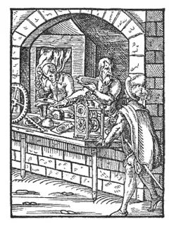 Dřevoryt Josta Ammana, Dílna hodináře doby renesanční, Norimberk 1568