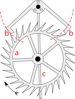 - krok, který spojuje oscilátor s posledním (nejrychlejším) kolem převodu, jež se nazývá krokové nebo stoupací kolo;