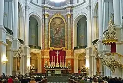Čistě barokní stavba má četné zvláštnosti, například oválnou chodbu pro procesí kolem hlavní lodi anebo věž s oválným půdorysem, aby kostel nepůsobil příliš mohutně. Z vnějšku zdobí fasádu 78 soch italského sochaře Lorenza Mattielliho, které představují různé svaté a církevní osobnosti (z toho 14 žen) a sedící alegorie: Víra (Fides), Láska (Caritas), Naděje (Spes) a Spravedlnost (Justita). Varhany jsou posledním dílem známého mistra Gottfrieda Silbermanna v Drážďanech.