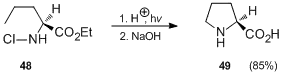 V roce 1980 použili J. P. Lavergne et al. tento postup k přípravě L-prolinu 49.[31]