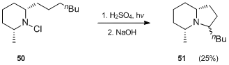 P. E. Sonnet a J. E. Oliver Hofmannovými–Löfflerovými–Freytagovými reakcemi připravili prekurzory mravenčích feromonů, jako je oktahydroindolizin 51.[32]